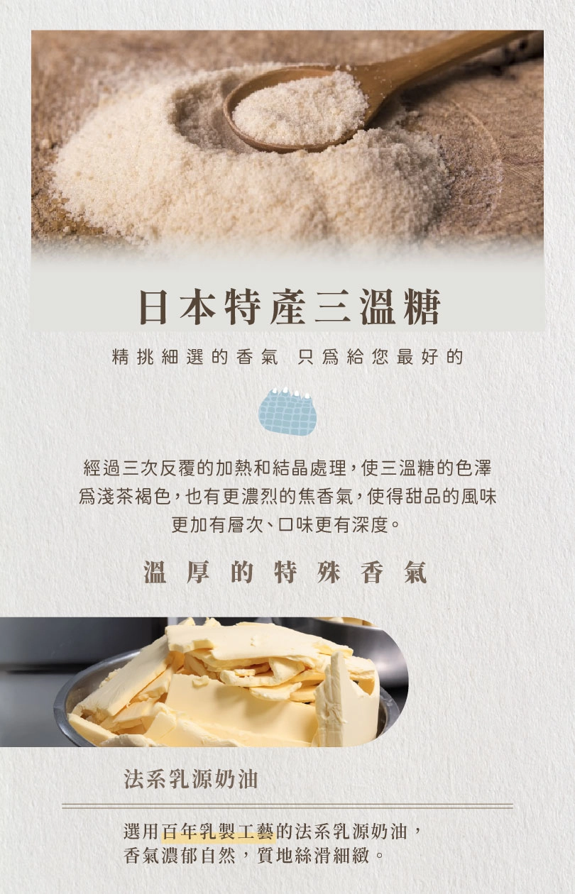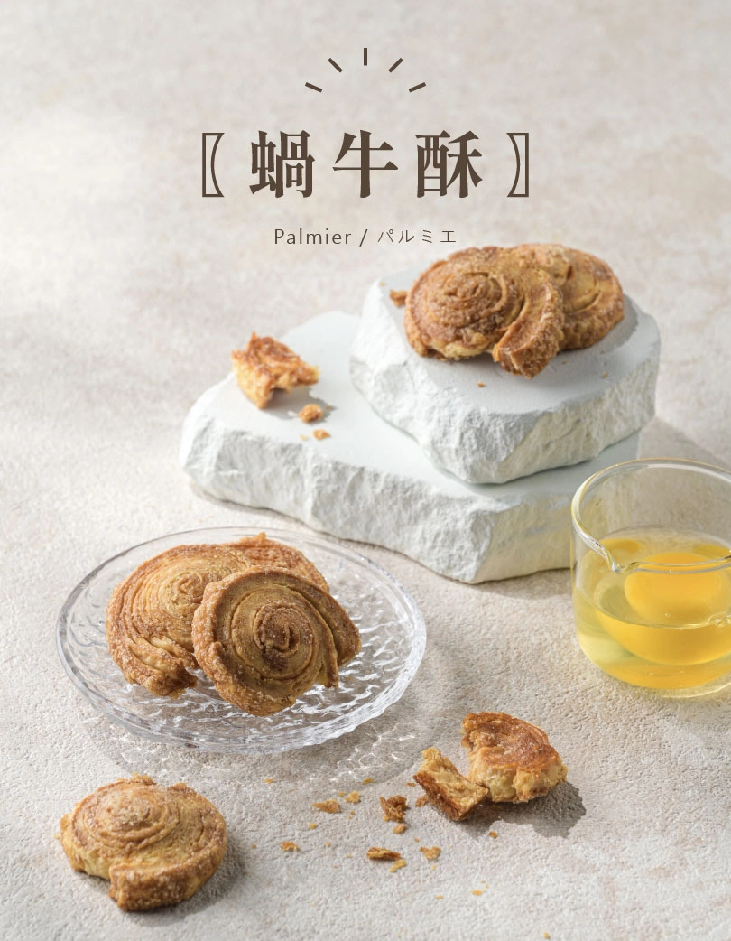 層層酥皮捲製成蝸牛造型外衣裹上糖粒再細心烤焙輕甜焦香味且酥脆有層次